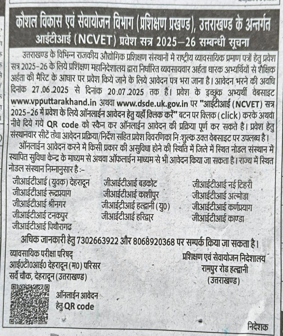 ITI चम्पावत में २०२५ के NCVT एडमिशन प्रारंभ